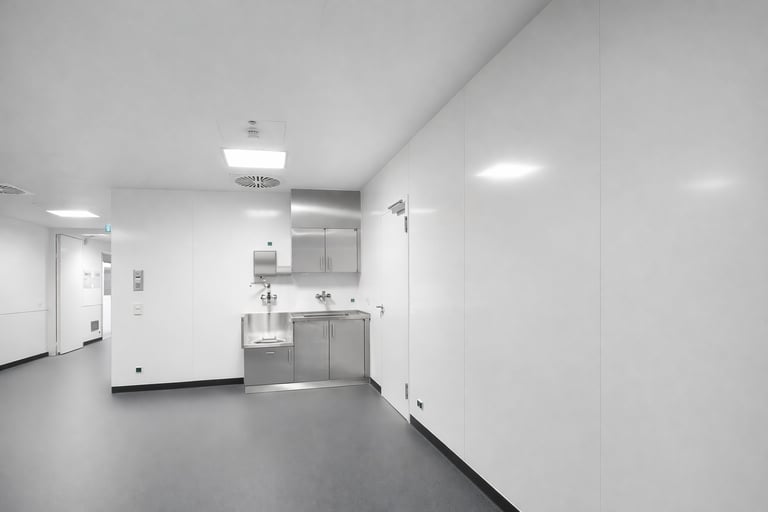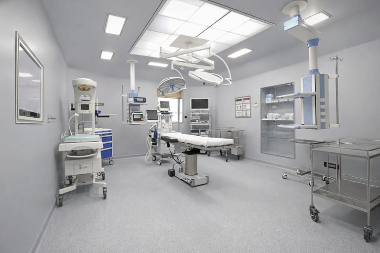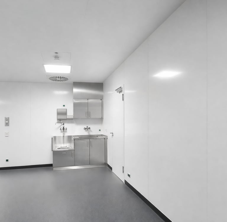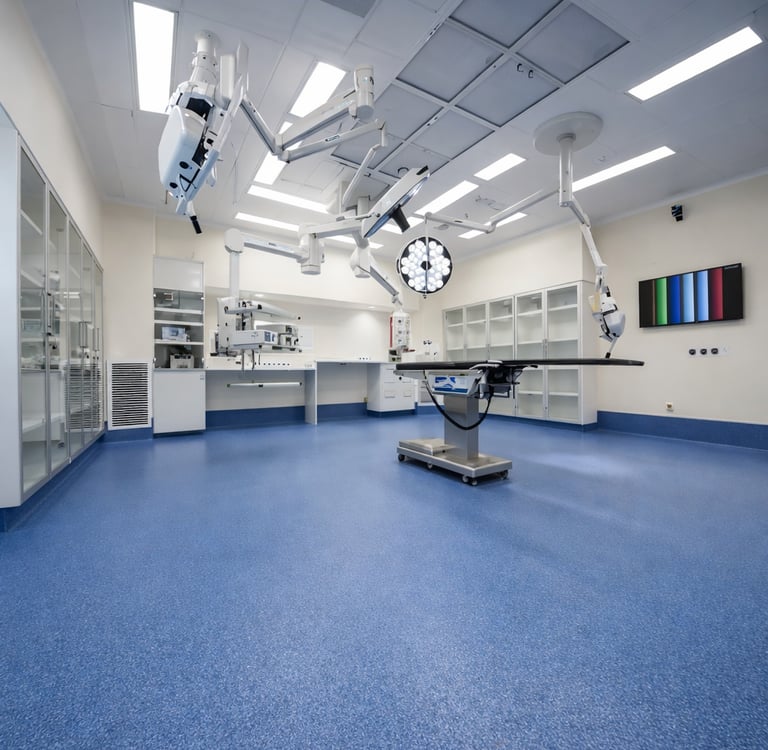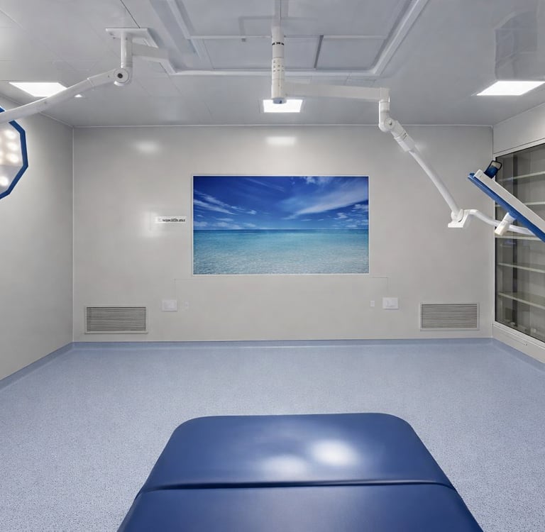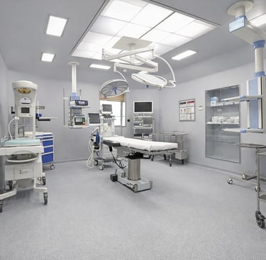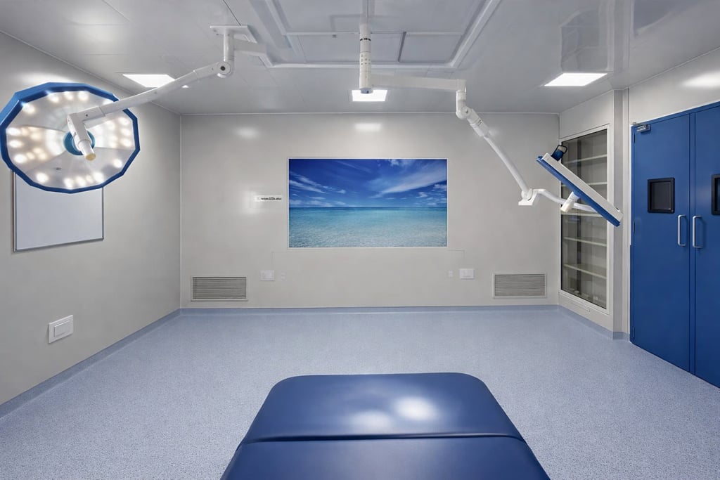 Wall & Ceiling Panels: GI powder-coated / SS304 / HPL Floor: Conductive / Homogeneous vinyl flooring Lighting: Peripheral & dome OT lights Integrated OT pendants and booms Plenum with HEPA and diffuser X-ray view panel, surgeon control panel