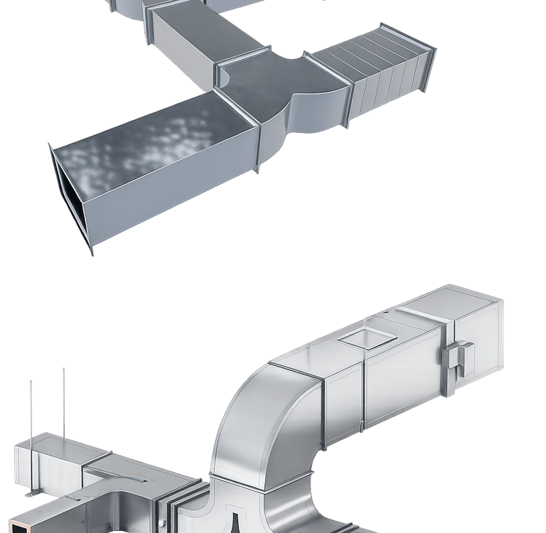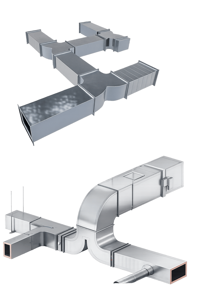 Materials: GI, PI, aluminum, SS Types: Supply/return/exhaust ducts Fabrication standards: SMACNA / IS Accessories: VCD, fire dampers, grills, diffusers